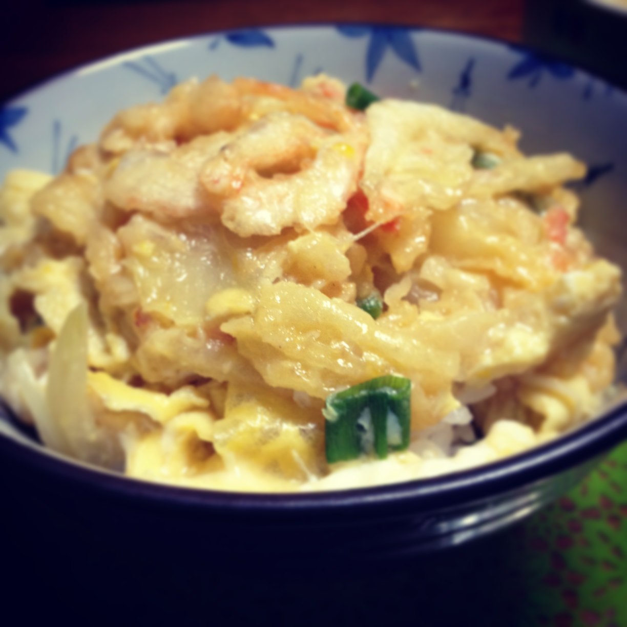 店で正月商材として置いていた白エビのかき揚げが売れ残り、美味しいの知ってるだけに買って帰って卵でとじて天とじ丼にしました。