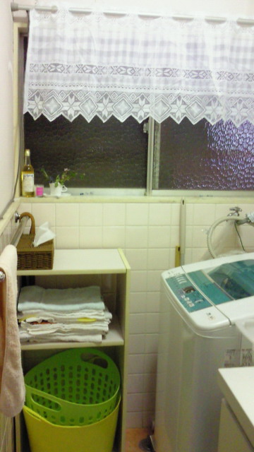 この画像のユニットボックスはカーテンをかけている上に留めつけてモノ入れにしていたものですが、それを下ろして背板と棚板をひとつ外してタオル置き場と洗濯籠置き場にしてみました。