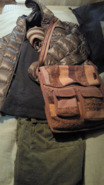 ウルトラプレミアムダウンとハイネックカットソー/UNIQLO、コーデュロイパンツ/BAS、マフラー/大阪にて購入、バッグ/Pasar、靴下/ダイソー、ムートンブーツ/SHOE PLAZA
