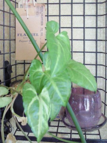 その上に観葉植物のシンゴジウムと