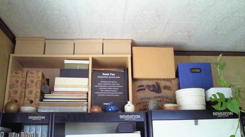 横倒しのユニットボックスに何やかやと詰め込んで、それでも入らないものはダンボールに詰めて積み上げてますw
