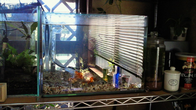 ちなみに小型水槽がふたつあり、金魚ともうひとつは主に水草を再生させるためのものです。