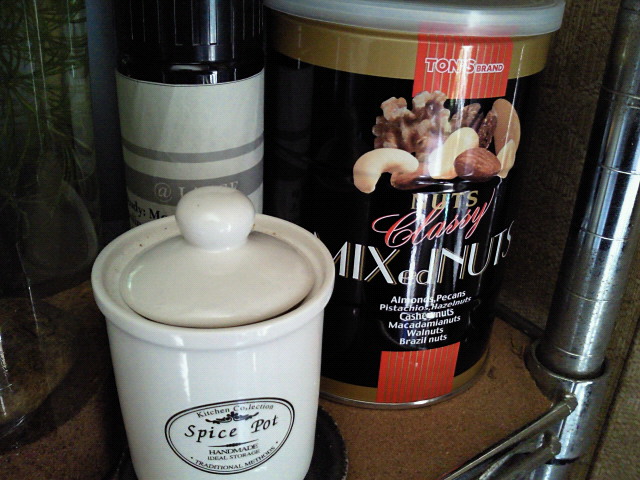 ミックスナッツの缶には金魚の餌を、黒いアイスの入れ物にはコリドラスの餌、スパイスポットにはメダカの餌がそれぞれに入ってます。