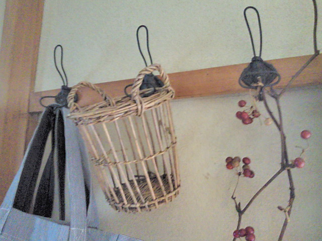 フックの右:クリスマスから飾っているサンキライ、中:100円ショップで用途も無く買った籠、左:バッグを重ね掛けしています。