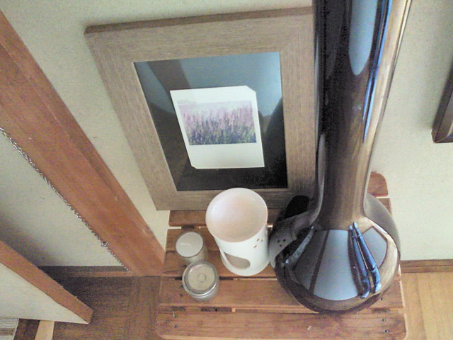 その横にあるのはアロマバナー、キャンドル、写真を額に入れて立てかけてます。